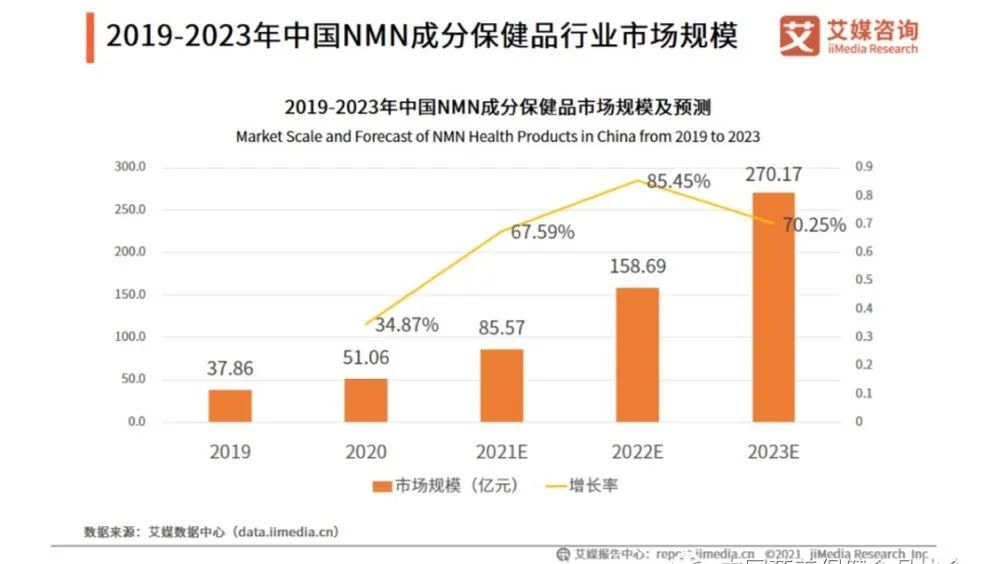中國作為NMN的最大消費市場,依據艾媒數據中心數據,2020年含NMN成分食品的市場規(guī)模達51.06億元,同比增長34.87%,預計到2023年將會以近70.25%的增速攀升至270.13億元,行業(yè)發(fā)展速度較快[2]。市場規(guī)模和增長率如下圖所示。
