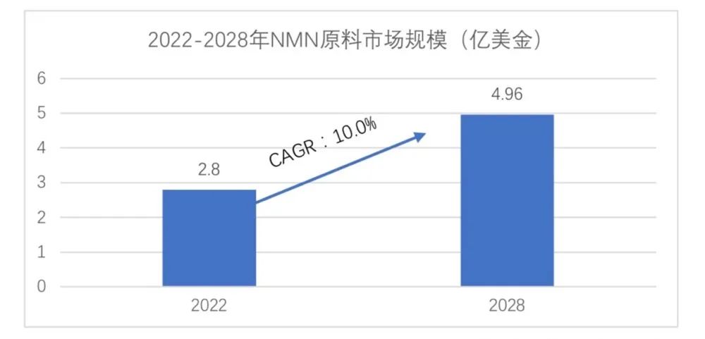 美國的市場研究公司(GlobeNewswire)的數據顯示,2022年全球NMN的原料市場銷售額預估為2.8億美金,其預測到2028年,NMN的原料銷售額將達到4.96億美金,年復合增長率達到10.0%[1]。主要的供應商包括基因港(GeneHarbor)、霍伯麥(Herbalmax)、日本新和制藥(Shinkowa)和音芙醫(yī)藥(EffePharm)。四家的原料合計占比達到了83%的市場占有率。