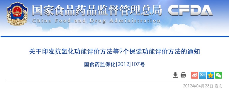 為貫徹落實《食品安全法》及其實施條例對保健食品實行嚴格監(jiān)管的要求,加強保健食品準(zhǔn)入管理,切實提高準(zhǔn)入門檻,國家食品藥品監(jiān)督管理局組織修訂了抗氧化等9個功能的評價方法,已經(jīng)保健食品安全專家委員會審議通過,現(xiàn)予印發(fā)。自2012年5月1日起,對受理的申報注冊保健食品的相關(guān)產(chǎn)品檢驗申請,保健食品注冊檢驗機構(gòu)應(yīng)當(dāng)按照新發(fā)布的9個功能評價方法開展產(chǎn)品功能評價試驗等各項工作。