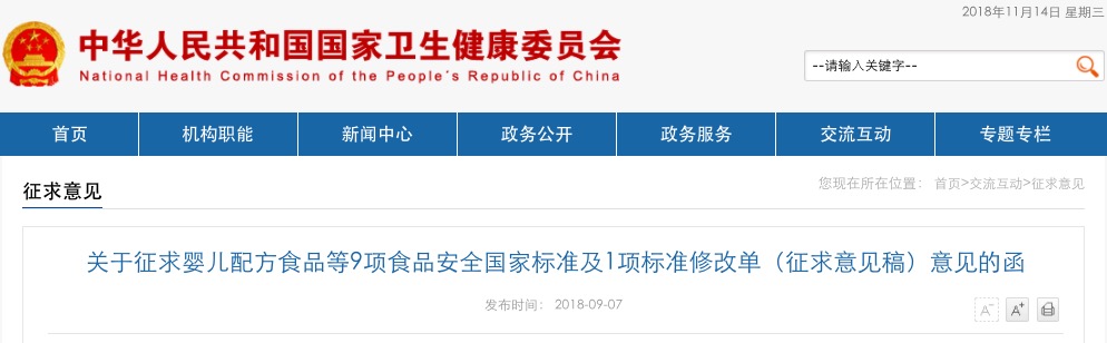 根據(jù)《食品安全法》規(guī)定,我委組織擬訂了《食品安全國家標(biāo)準(zhǔn) 嬰兒配方食品》等9項食品安全國家標(biāo)準(zhǔn)(征求意見稿)和《食品安全國家標(biāo)準(zhǔn) 運動營養(yǎng)食品通則》(GB 24154-2015)第1號修改單(征求意見稿),現(xiàn)向社會公開征求意見。請于2018年10月30日前登錄食品安全國家標(biāo)準(zhǔn)管理信息系統(tǒng)(http://bz.cfsa.net.cn/cfsa_aiguo)在線提交反饋意見。